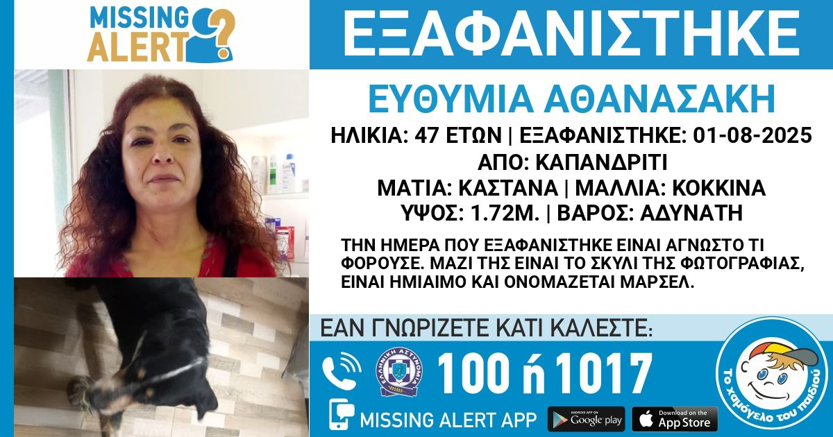 Συναγερμός έχει σημάνει στις Αρχές για την εξαφάνιση 47χρονης από το Καπανδρίτι. Πρόκειται για την Ευθυμία Αθανασάκη, τα ίχνη της οποίας χάθηκαν από την περιοχή την 1η Αυγούστου.
